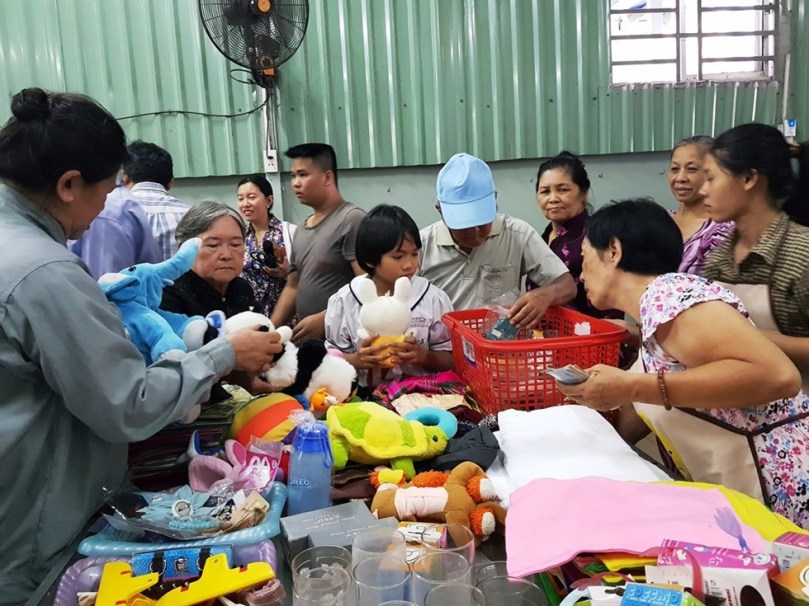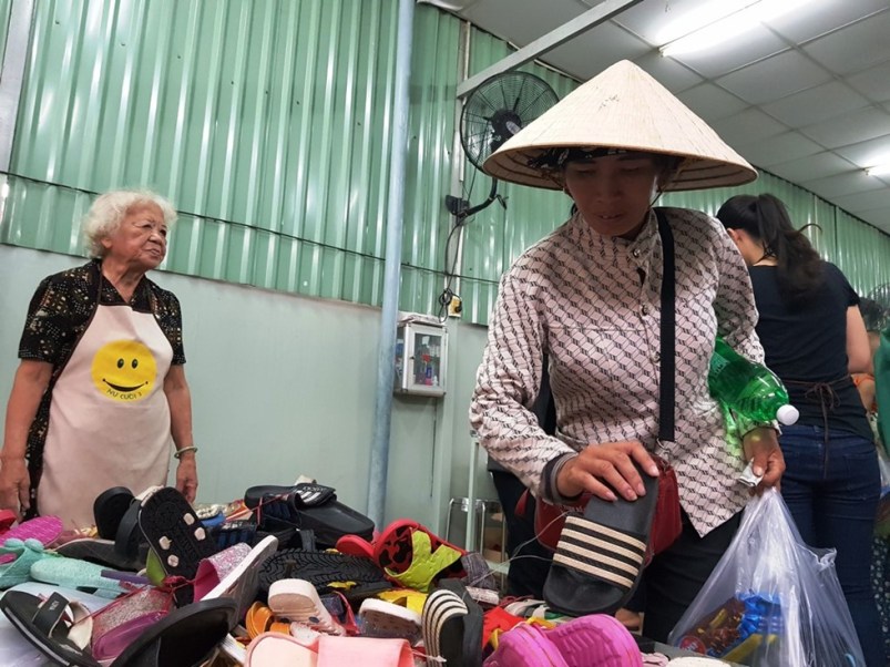 Tới khoảng 11 giờ 15, những người lao động nghèo đến đông nghẹt quán, ai cũng tất bật lựa cho mình những nhu yếu phẩm và cả quần áo, đồ chơi “cũ người mới ta”. Nhiều người mua xong tranh thủ ra đường tìm thêm những người cùng hoàn cảnh với mình để rủ vào phiên chợ. Ai cũng mồ hôi nhễ nhại vậy mà cười tươi rói.