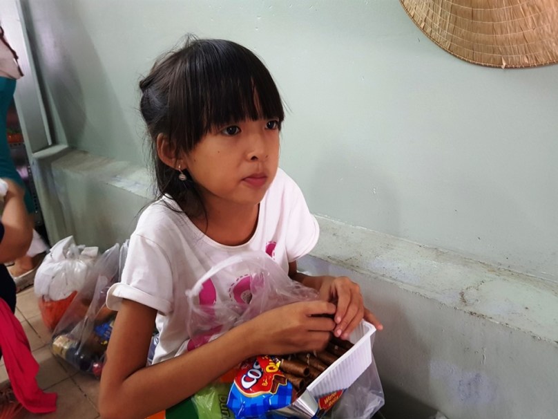 Bé Nhi (6 tuổi) vừa được mẹ mua cho bịch bánh quế đã ngồi bóc ăn ngon lành ngay tại chỗ