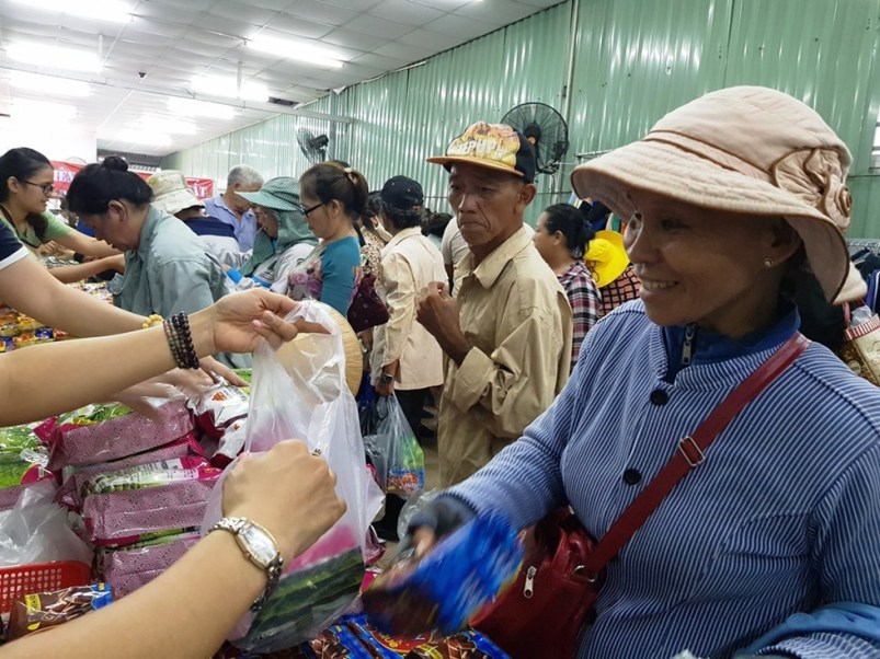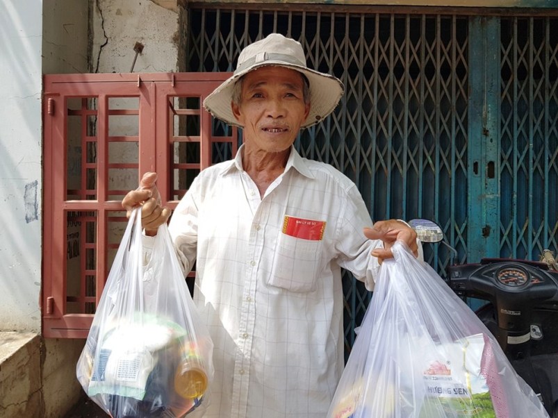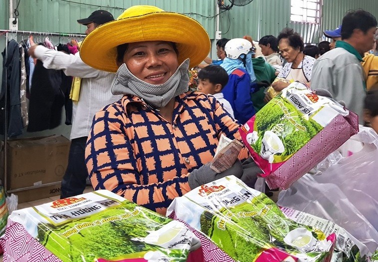 Ông Hoàng Xuân Đông (67 tuổi, bán vé số) cũng xách 2 bịch đồ nặng trịch bước ra cửa mà vui như vừa đi hội về. Ông nói bằng giọng rặc Phú Yên: “Ngày nay tui tưởng đến ăn cơm như bình thường thôi mà mua được tùm lum đồ hết nè. Dầu ăn, mì gói, trà, bột ngọt, nước ngọt đủ cả,… Tết này bớt lo rồi”.