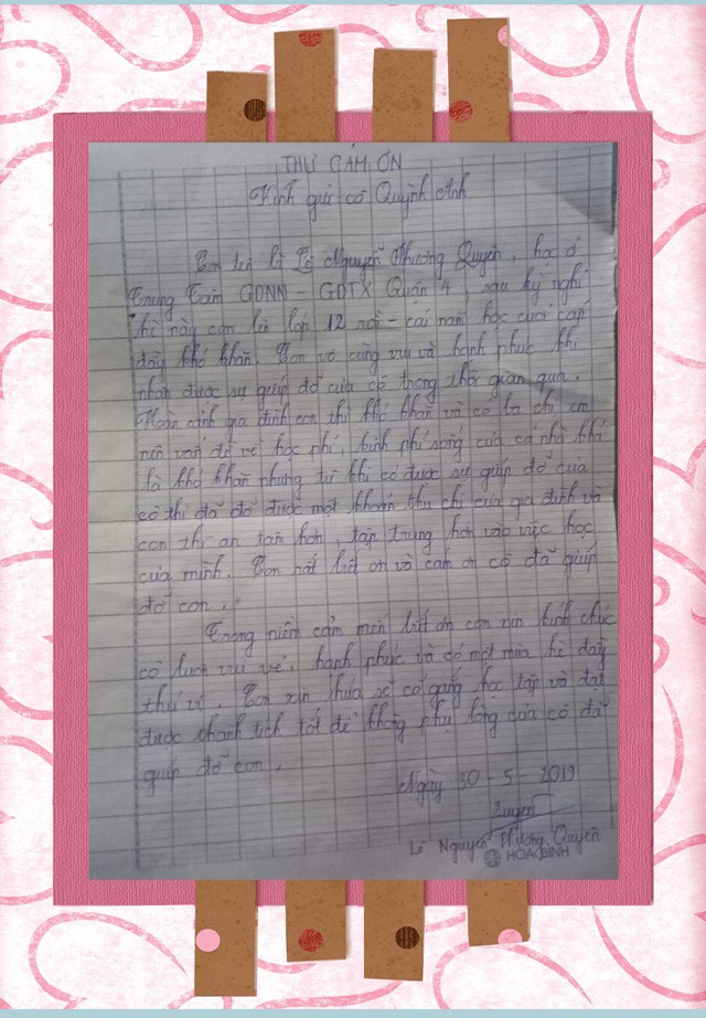 | 015 | 1999 | Nhà không số, hẽm 180 Bùi Văn Ba,P. Tân Thuận Đông, Quận 7 | Nguyễn Thị Thu Oanh (Mẹ) 090 9382xxx | Cô Quỳnh Anh |