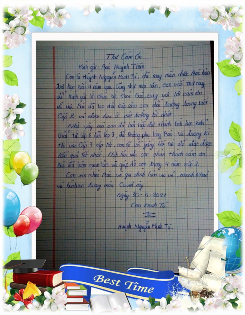 | Chi phí năm học: – Tổng chi phí cho 79 học sinh Năm học 2020-2021: 513,552,000 đồng (Thấp nhất là 3,663,000 đồng (Lớp 8) – Cao nhất là 20,563,000 đồng (Đại học)) => Bình quân: 6,500,000 đồng/1 học sinh/ 1 năm học |