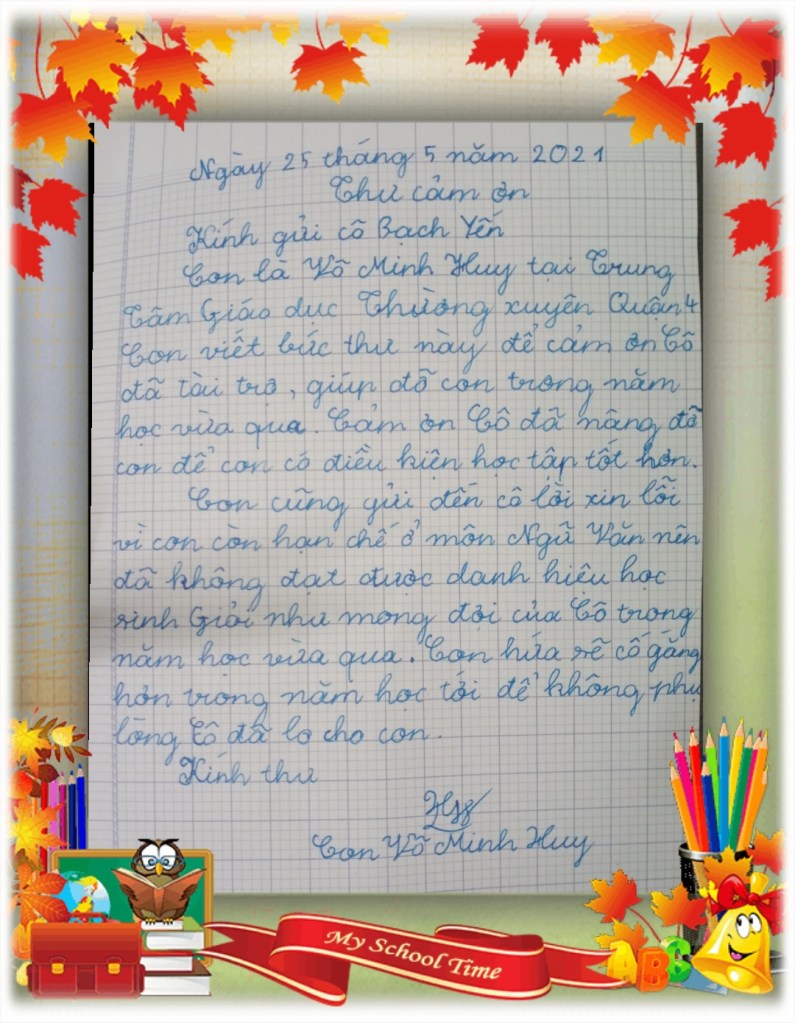 | Chi phí năm học: – Tổng chi phí cho 79 học sinh Năm học 2020-2021: 513,552,000 đồng (Thấp nhất là 3,663,000 đồng (Lớp 8) – Cao nhất là 20,563,000 đồng (Đại học)) => Bình quân: 6,500,000 đồng/1 học sinh/ 1 năm học |