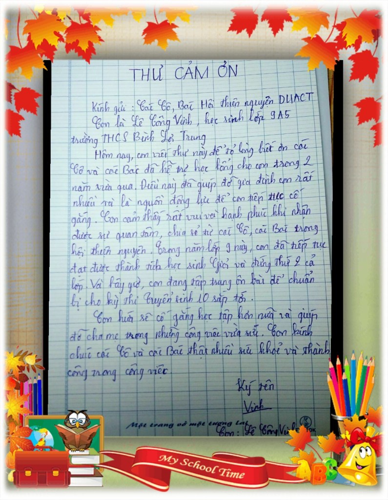 | Chi phí năm học: – Tổng chi phí cho 79 học sinh Năm học 2020-2021: 513,552,000 đồng (Thấp nhất là 3,663,000 đồng (Lớp 8) – Cao nhất là 20,563,000 đồng (Đại học)) => Bình quân: 6,500,000 đồng/1 học sinh/ 1 năm học |