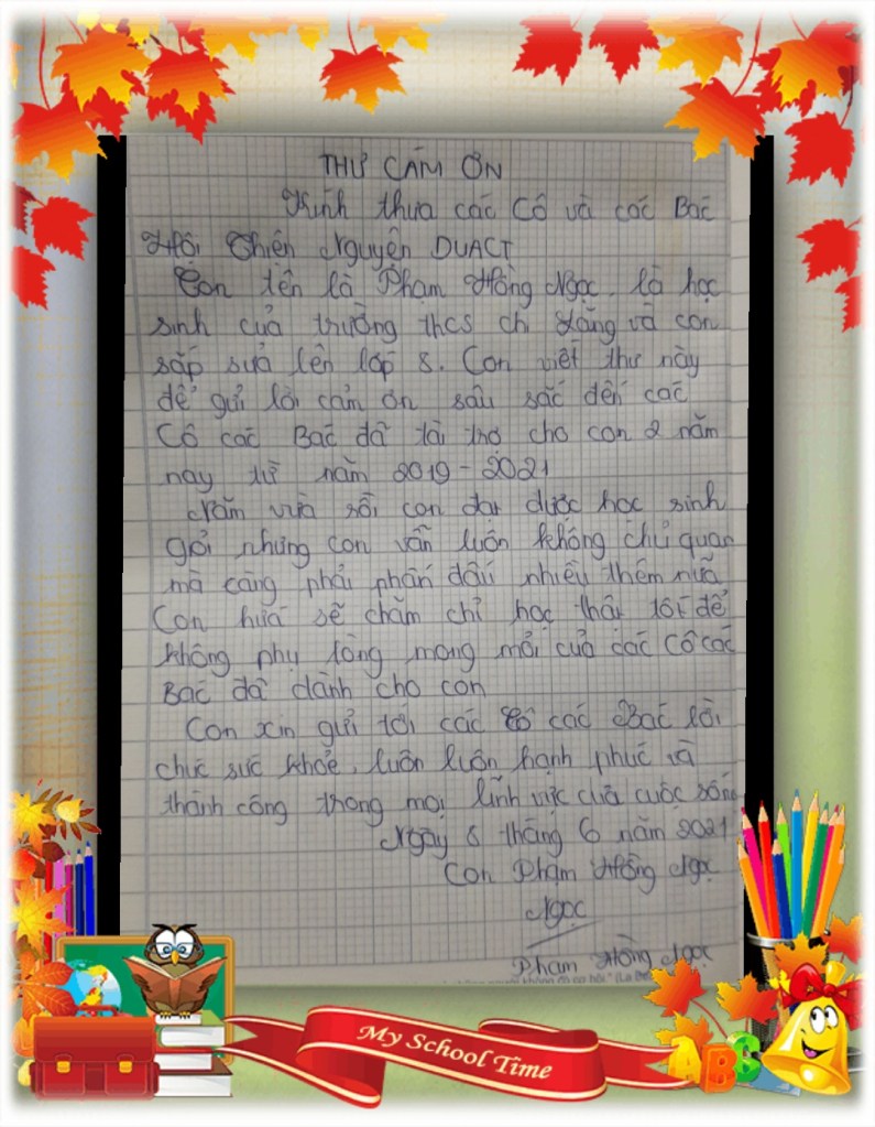 | Chi phí năm học: – Tổng chi phí cho 79 học sinh Năm học 2020-2021: 513,552,000 đồng (Thấp nhất là 3,663,000 đồng (Lớp 8) – Cao nhất là 20,563,000 đồng (Đại học)) => Bình quân: 6,500,000 đồng/1 học sinh/ 1 năm học |