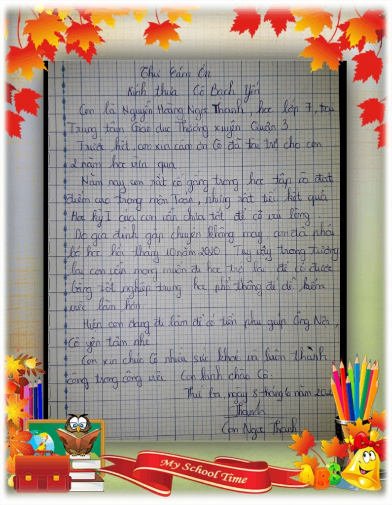 | Chi phí năm học: – Tổng chi phí cho 79 học sinh Năm học 2020-2021: 513,552,000 đồng (Thấp nhất là 3,663,000 đồng (Lớp 8) – Cao nhất là 20,563,000 đồng (Đại học)) => Bình quân: 6,500,000 đồng/1 học sinh/ 1 năm học |