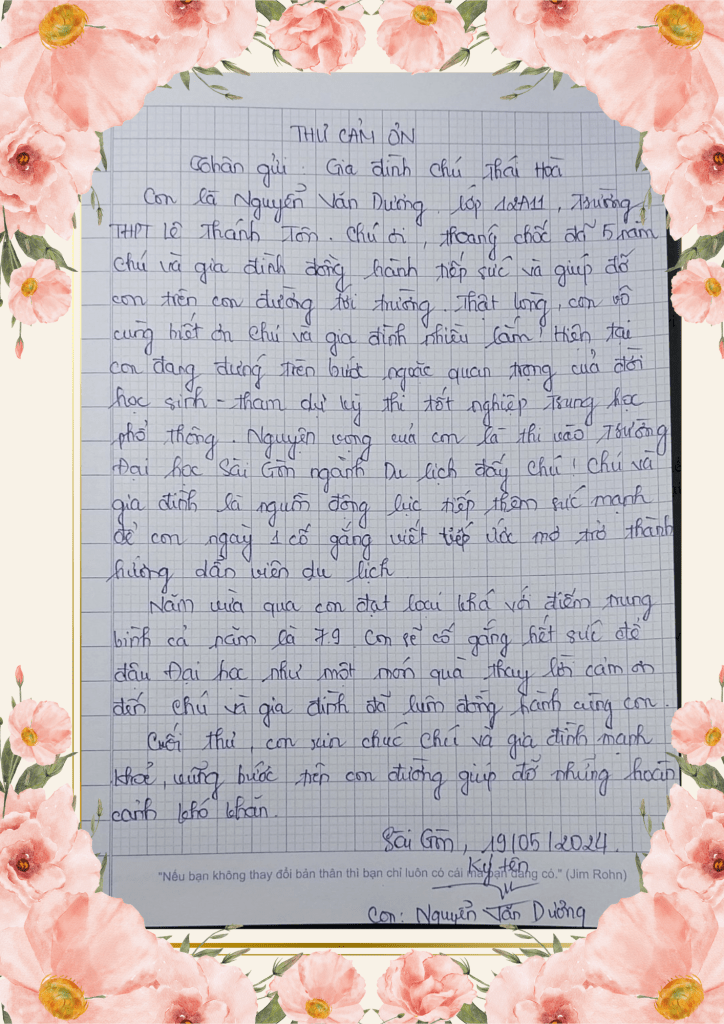 | 023 | 2005 | 156/46C4 Nguyễn Thị Thập, KP4A, Tổ 39, P Bình Thuận, Quận 7. | Cha: Nguyễn Văn Út | Gia đình Vũ Thái Hòa |