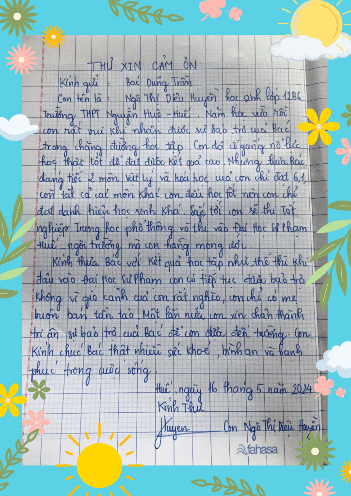 | 090 | 2006 | Tổ 7 Khu vực 3, phường An Hòa, thành phố Huế | Mẹ: Nguyễn Thị Phượng | Ông Dũng Trần |