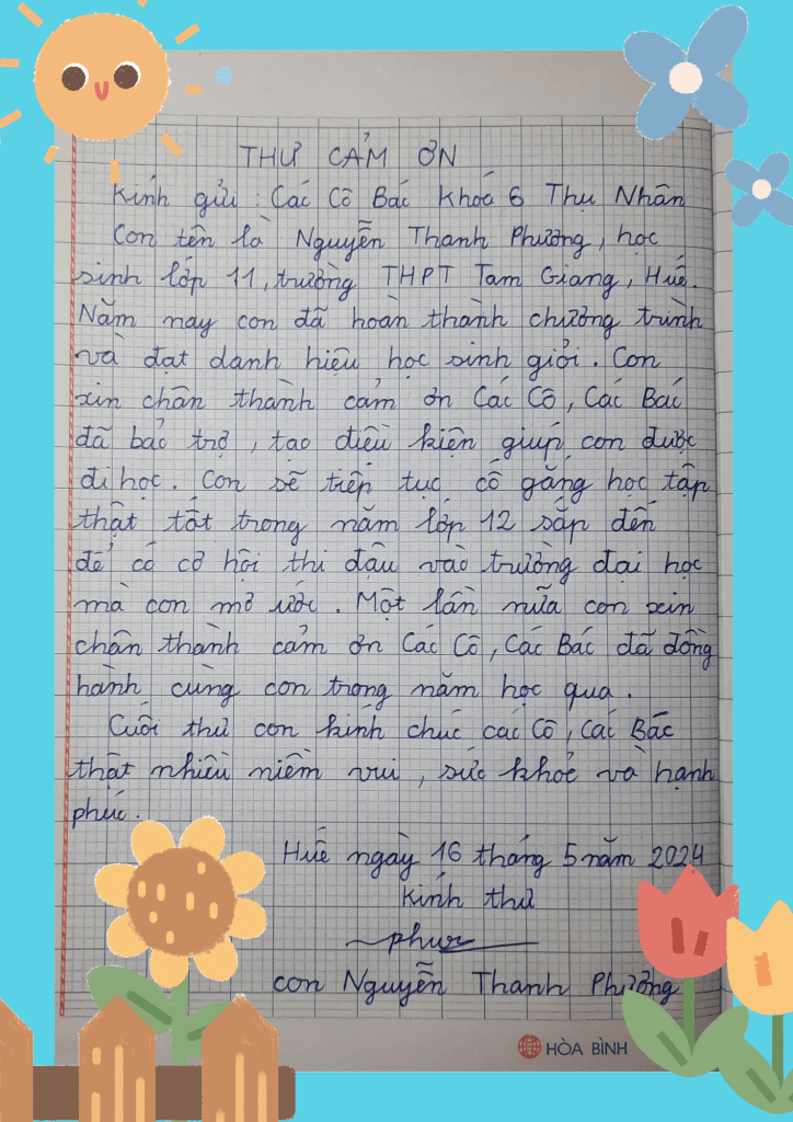 | 092 | 2007 | Thôn 5, xã Điền Hòa, huyện Phong Điền, tỉnh Thừa Thiên Huế | Mẹ: Đặng Thị Lài | Anh Chị Em Khóa 6 Thụ Nhân – CTKD |