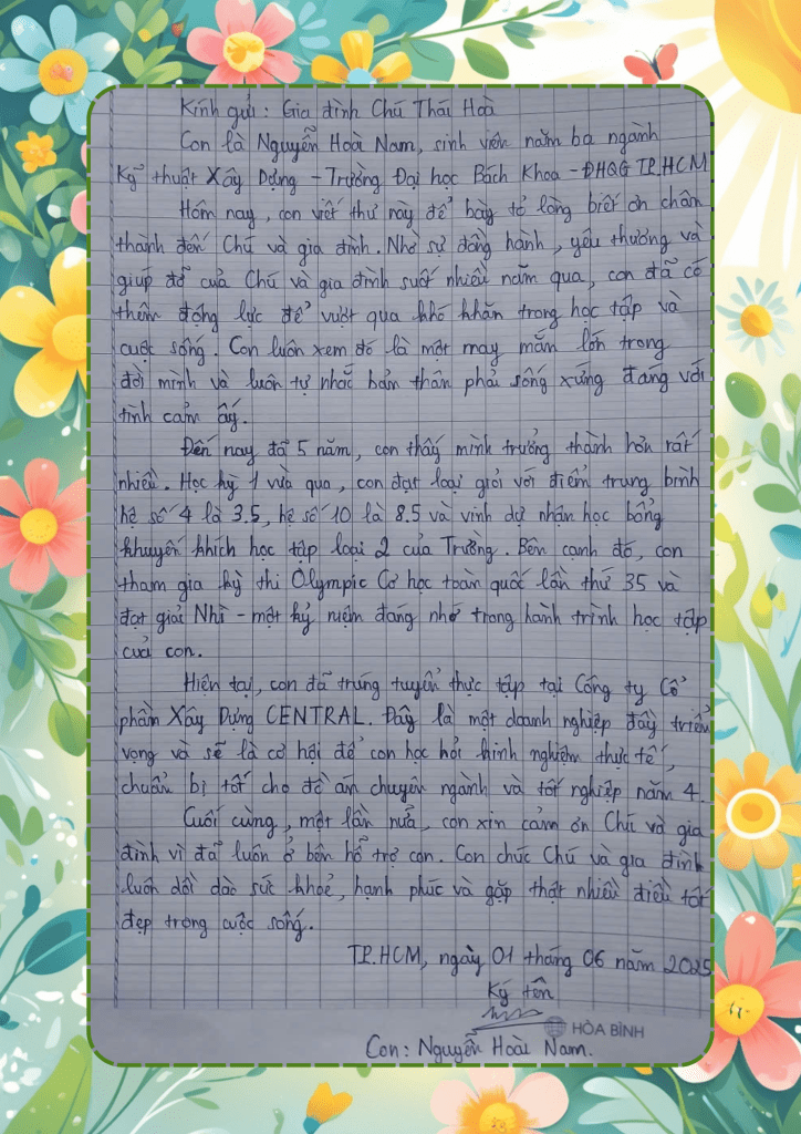 | 001 | 2004 | 257 Ấp Bình Thuận, Xã bình Khánh, huyện Cần Giờ, TP. HCM | Cha: Nguyễn Thành Dũng | Gia đình Vũ Thái Hòa |