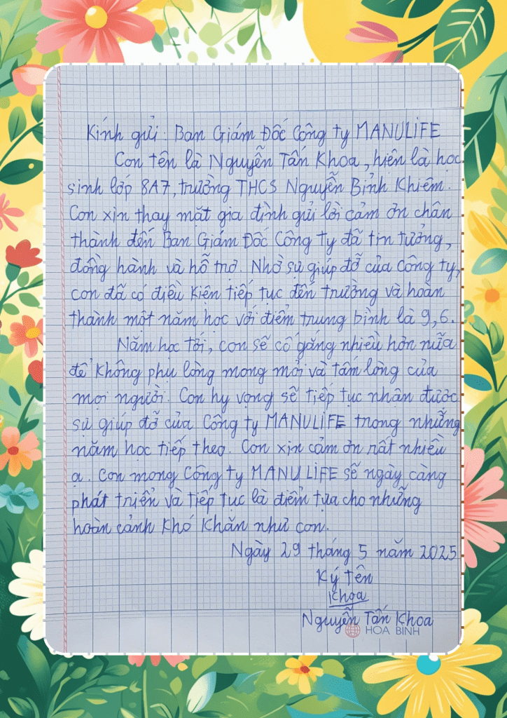 | 043 | 2011 | 12/2 Tổ 16, khu phố 17, Nhà Bè, TP HCM | Mẹ: Nguyễn Thị Hoàng Hoa | MANULIFE |
